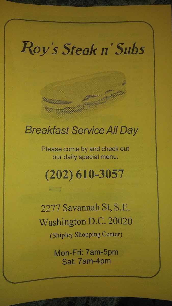 Located at 2279 Savannah St SE in Washington, DC, Roy's Steak & Subs Menu offers a satisfying selection of mouthwatering dishes for every craving. Whether you're in the mood for a perfectly grilled steak or a hearty sub packed with flavor, this cozy spot has something for everyone. The menu features an array of fresh ingredients, from tender cuts of steak to crispy fries and signature subs, all served with a side of great hospitality. It's the ideal place for a quick bite or a laid-back meal with friends and family. Whether you're stopping by for lunch or dinner, Roy's promises a meal that will hit the spot every time.